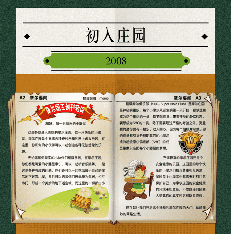 在这一年,,摩尔庄园诞生了。。。在这里,,,,大家都是可爱的红鼻子鼹鼠小摩尔,,,,可以一起勤劳耕作,,一起高山滑雪......我们都是摩尔庄园的建设者。。。。