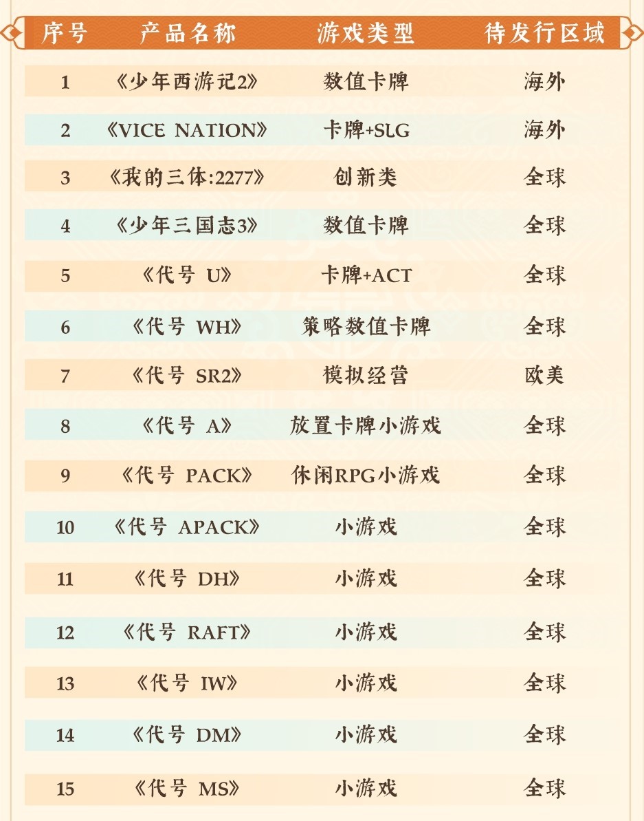 首款《三体》IP正版授权游戏《我的三体::::2277》已开放预约,,,另有现代都市题材SLG《Vice Nation》、、、少年系列重磅新品《少年三国志3》、、、、模拟经营全平台游戏《代号::::SR2》等产品储备。。此外在小游戏赛道上,,,《代号 A》《代号 Pack》《代号 DH》等也将陆续开启测试,,伴随多款新品的陆续上线有望进一步撬动增长空间。。
