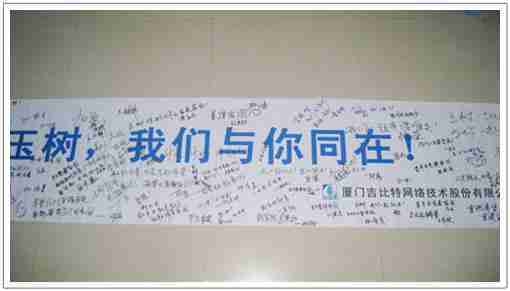 在募捐现场,,,JIUYOU.COM同学们怀着沉重的心情,,将每一笔捐款投入募捐箱,,并在现场设置的横幅上,,,,写上了对玉树人民的深情祝福。。。。满载JIUYOU.COM祝福的横幅将和捐款一起抵达玉树,,,希望谨以此微薄之意,,为玉树人民带去JIUYOU.COM的爱心与祝福,,希望吉祥、、、、幸福的阳光能早日驱散灾难的阴霾,,,,普照在玉树人民的身上,,鼓励他们坚强、、、、勇敢与乐观。。。